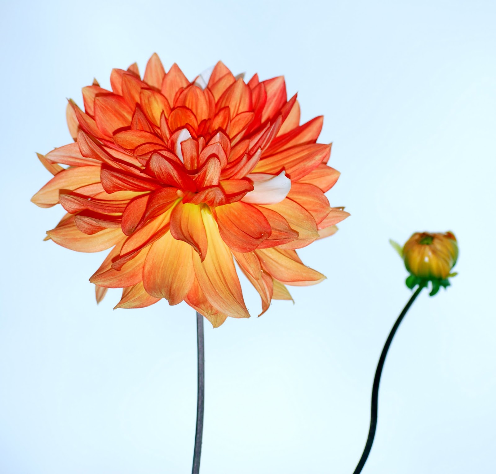 At the time I did not even know it was a dahlia, mostly being drawn in by the gorgeous color. Getting back into the car that day, which was gray and gloomy, I might add, I heard the song, Lucy in the Sky with Diamonds, and a title was born for this photograph. Not the diamonds part ,but I thought of Lucille Ball, and since I'd laid down on the ground and taken it against the sky....well, it only seemed fitting. People often wondered how I came up with titles and now you, too, know my secrets.
