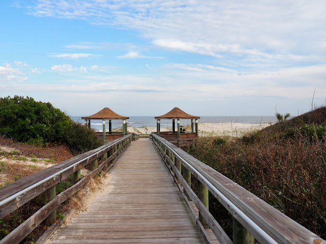 In reality we learned more than we wanted to even think about.Driving onto the property, there are the remnants of about 25 slave cabins and I don't have to tell you how horrible that feels.No roofs remain aside from the one building. At first we thought the round holes were windows but as it turns out, they were part of building with what is called tabby, sort of a shell based concrete.This page has an archived photograph of the cabins with roofs. Thankfully we had to leave to catch the ferry for our return journey to the campground, both pretty shook up. We don't often think about slaves in Florida, rather other states because no one really thinks of Florida as the South, but now we know better.Retracing our drive, we got to the ferry just in time to board and before long we were back at the campground where I had Bruce stop at beach entrance one where I popped out of the car for a look-see. Finally the sky was clearing! The grasses are flattened from the storm, and very few folks were out as the daylight was beginning to wane.