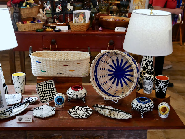 My goodness, how about a beautiful Strawberry Oak Hydrangea plant???All that rain makes for huge flowering bushes! The apples are looking very good as well.Let's talk about Barn Swallows, shall we? They were also present flying around fast and furious as they needed to feed their hungry broods.It can't be easy being a bird is one thing that comes to mind. Here's some info on them should you be curious and want to improve your knowledge when it comes to their lifestyle. Pop quiz in my next post! Just joking, but boy do I have some exciting photographs coming up with their interesting behavior.I've not even shown you the studios for all of the classes because, frankly, this has probably gone on long enough, but before I call it a published post, I wanted to show off some of the amazing pottery done by our friend Susan Bach who taught a week-long pottery class there in early June. She is the black, white, and bold color queen. Aren't those drinking glasses amazing? I'm only sorry I cut off one of her lamps in this photo as they are terrific, as is everything she makes.