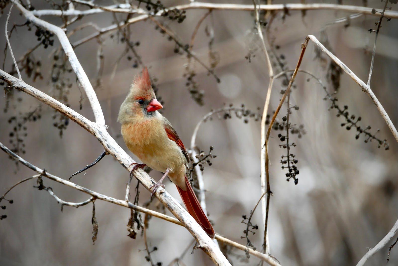 Don't get too used to exciting bird shots, or at the very least interesting, because soon enough, with leaves on the trees, they will not be nearly so easy to spot.No, we have not had any bluebirds near the house but they are fairly easy to find at the park adjacent to the river. Honestly I cannot get enough of those pretty birds.Just this morning I saw a Tufted Titmouse enter Bruce's bird house several times!!! Checking out the real estate? Only time will tell.Our feeders are emptied nearly as quickly as Bruce can fill them, providing, especially this obsessed woman, a lot of entertainment. Last week we had a new guest, a House Finch came to check things out.