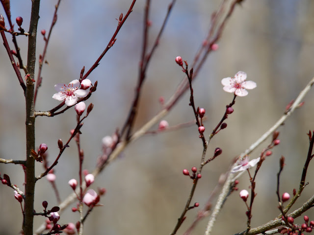 one of the trees has begun blooming,as has the Forsythia. I've begun seeing Forsythia around town and it is going to be pretty spectacular, probably before we know it!And, of course there are the birds.